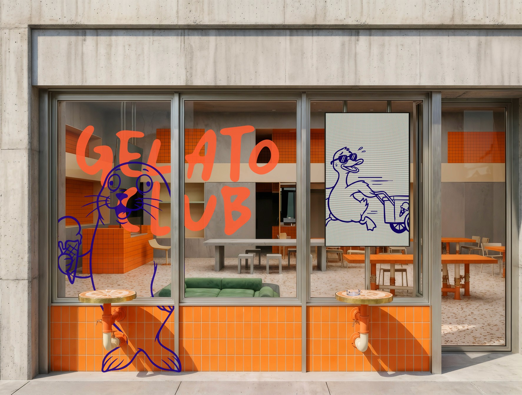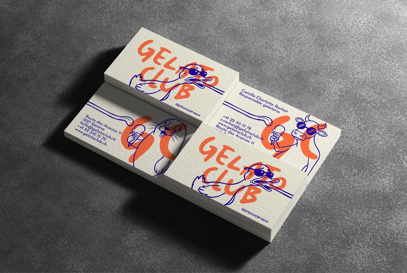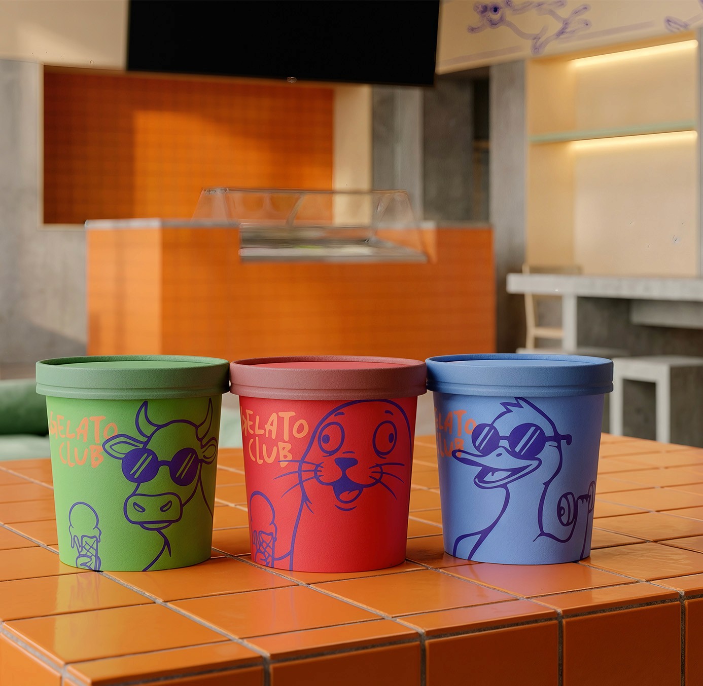 Gelato Club is a conceptual gelateria brand exploring playful visual identity, character design and spatial branding. Bold typography, illustrated mascots and vibrant colors create a distinctive universe applied across packaging, merchandise and retail space design.
