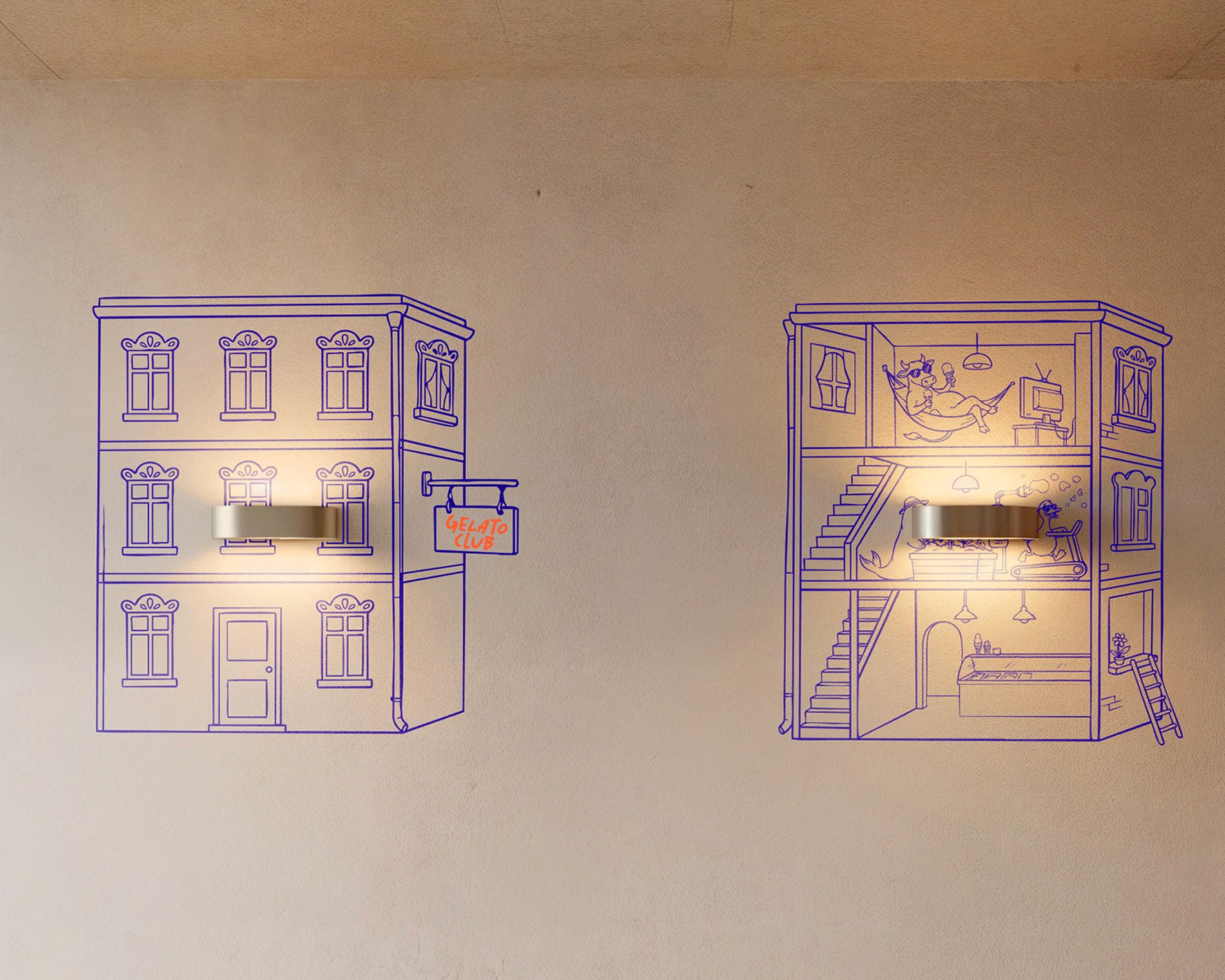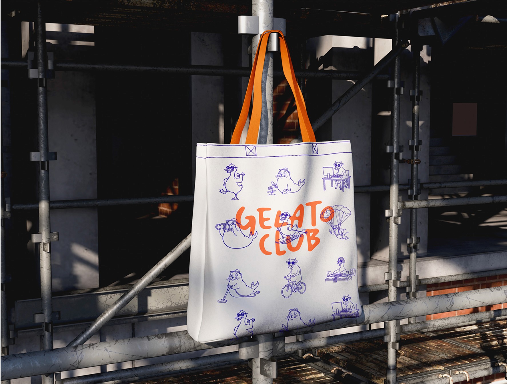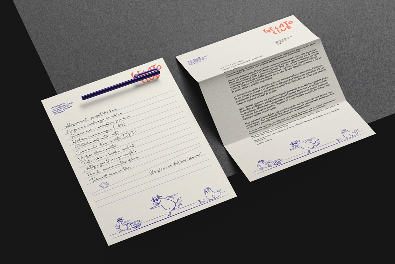 Gelato Club is a conceptual gelateria brand exploring playful visual identity, character design and spatial branding. Bold typography, illustrated mascots and vibrant colors create a distinctive universe applied across packaging, merchandise and retail space design.